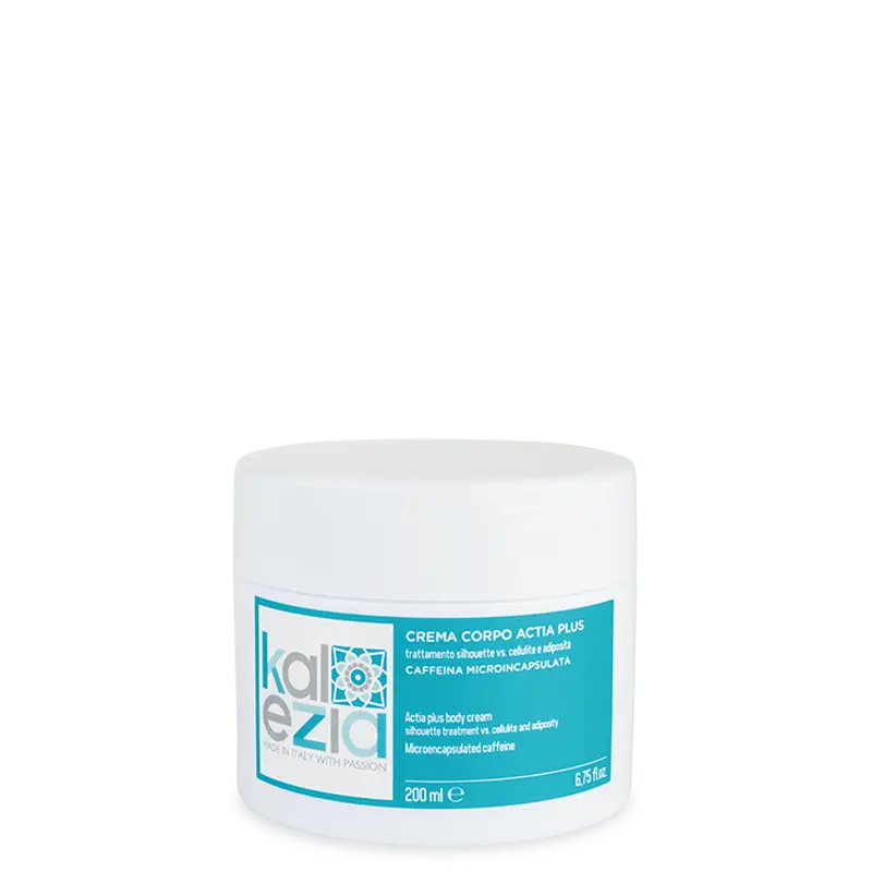 Crema corpo Actia Plus, trattamento intensivo che abbina l’azione lipolitica della caffeina a quella drenante e decongestionante degli estratti di edera, laminaria, tè verde e ippocastano.